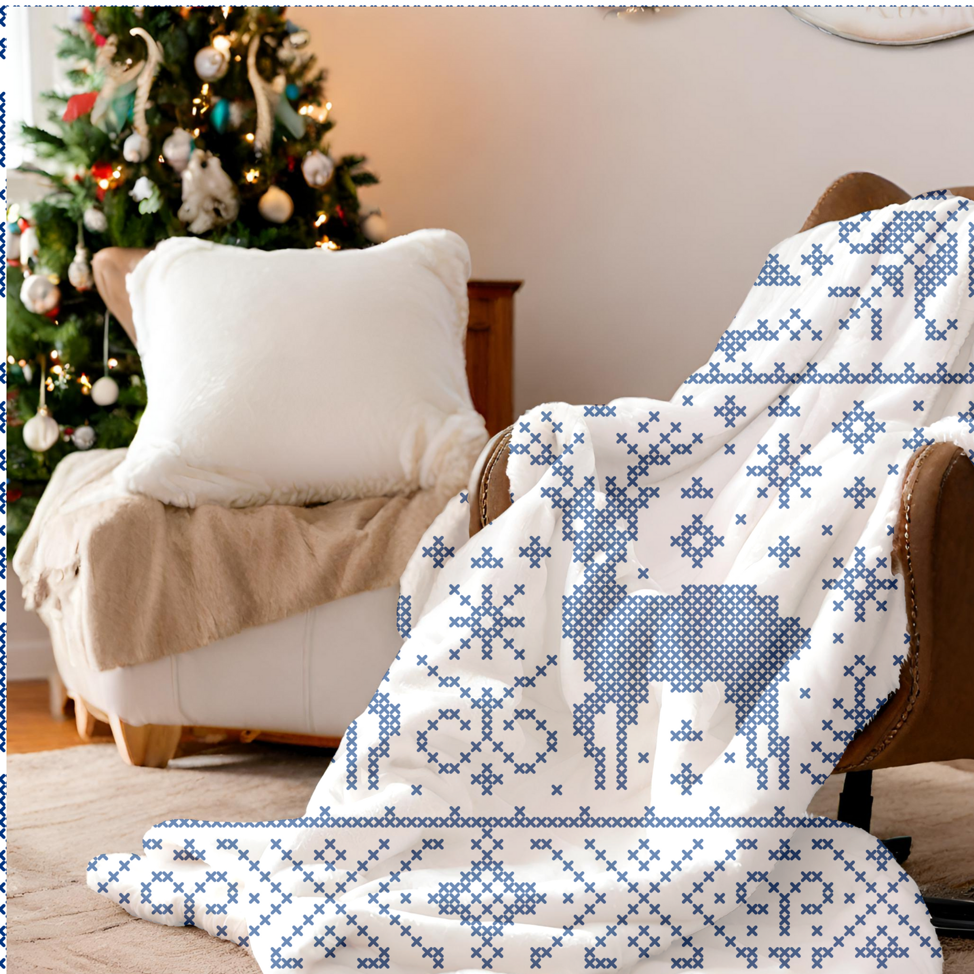 Blue Snowflake Holiday Plush Blanket, Cozy Winter Decor, Soft Throw Blanket, Reindeer Pattern, Festive Gift